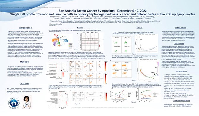 The other research finding of Professor Liao Ning’s team was “Single cell profile of tumor and immune cells in primary triple-negative breast cancer and different sites in the axillary lymph nodes”. After winning the first prize for excellent papers at the 17th National Breast Cancer Conference, it was accepted by this year’s SABCS and presented in the form of a poster to global medical professionals and scholars. The study for the first time made it clear that in the process that breast cancer cells develop from primary lesion to metastatic lymph nodes, sentinel lymph nodes are the position where tumor cells and immune cells fight against each other initially. In addition, the study affirmed that sentinel lymph nodes are the first battlefield for tumor cells and immune cells in different subtypes of breast cancer. The study is of great significance in advancing the process of curing breast cancer, which has been highly recognized by peers both at home and abroad.