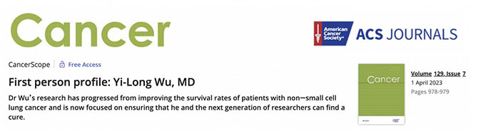 Cancer, the official journal of the American Cancer Society, publishes featured columns in “CancerScope” and first person profiles for scholars with academic influence in various fields internationally. “Dr. Wu’s research has progressed from improving the survival rates of patients with non-small cell lung cancer and is now focused on ensuring that he and the next generation of researchers can find a cure.” was the title of the “CancerScope” of Cancer issued in April 2023. This column introduced the personal academic experience of Dr. Wu from three aspects, involving academic start, research course, and contributions.