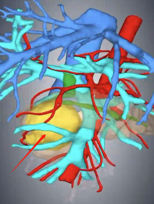 Accurate evaluation of the relationship between the tumor (yellow area pointed by the red arrow) and surrounding blood vessels using preoperative imaging 3D reconstruction