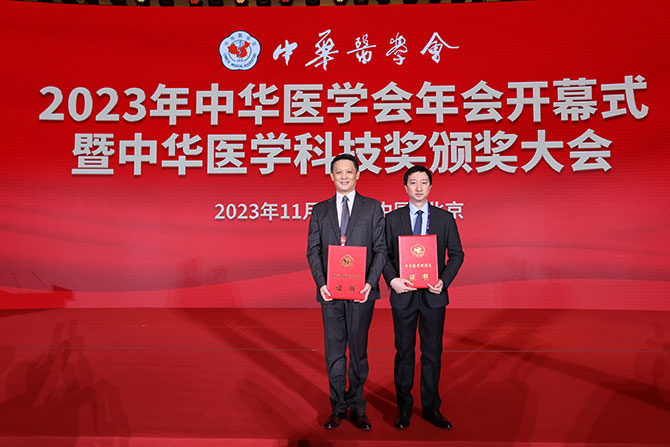 On November 26, the award ceremony of 2023 Chinese Medical Science and Technology Award was held in Beijing. The research on "Establishment and Wide Implementation of Targeted Therapy System for Perioperative Period of Lung Cancer" led by Professor Wenzhao Zhong’s team, and "Establishment and Wide Implementation of Diagnostic and Therapeutic Technology System for Pulmonary Arterial Hypertension" led by Professor Jing Zhicheng ’s team, both won the first prize of the Chinese Medical Science and Technology Award.