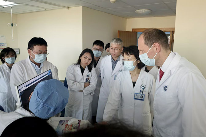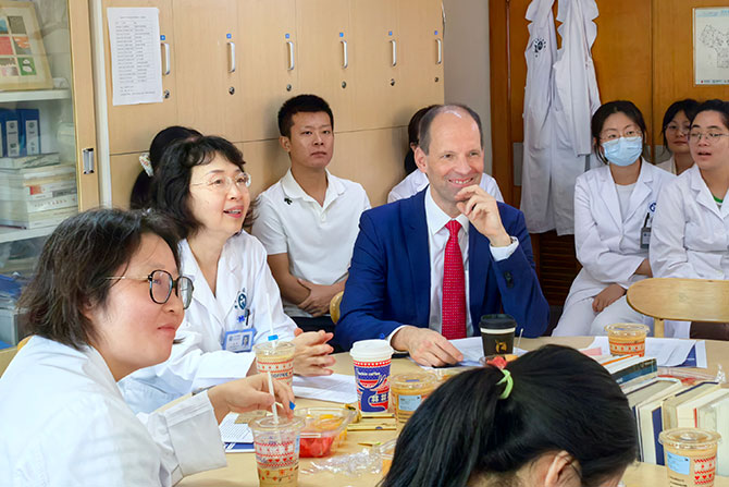 During the ward rounds, Prof. Aringer conducted thorough consultations and physical examinations of two patients with complex cases. One case was a patient with suspected SLE but with numerous diagnostic uncertainties, and the other was a severe SLE patient with concurrent heart failure, acute alveolar hemorrhage, and thrombotic microangiopathy. Following the ward rounds, Prof. Aringer joined the MDT case discussion, where experts from the Departments of Cardiology, Nephrology, Pathology, Laboratory Medicine, and Respiratory and Critical Care Medicine shared their insights on diagnostic challenges, treatment options, and the importance of multidisciplinary collaboration. Prof. Aringer provided in-depth and detailed analyses of the cases based on the latest international guidelines and clinical experience, and offered valuable diagnostic and therapeutic suggestions. He highly praised the professionalism and rigor of the rheumatology and immunology team in managing complex cases, emphasizing that such an academic atmosphere and multidisciplinary team spirit are crucial, reflecting advanced international standards in rheumatology and immunology care.