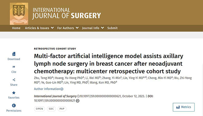 Prof. Wang Kun’s team from the Department of Breast Cancer of our hospital has been striving to solve the worldwide problem of how to predict the efficacy of neoadjuvant chemotherapy for breast cancer at an early stage. Since the research findings on the prediction of pathological complete remission of breast cancer after neoadjuvant chemotherapy by temporally dynamic imaging omics were published in eClinical Medicine (impact factor: 17.03), a sub-journal of Lancet, at the beginning of this year, Prof. Wang Kun’s team has published the heavyweight findings titled “Multi-factor Artificial Intelligence Model Assists Axillary Lymph Node Surgery in Breast Cancer after Neoadjuvant Chemotherapy: Multicenter Retrospective Cohort Study” on the top-tier surgical journal The International Journal of Surgery (impact factor: 15.3) in collaboration with the First Affiliated Hospital of Sun Yat-sen University, the First People’s Hospital of Foshan, and Shantou Central Hospital again. The first authors of this paper are Dr. Zhu Teng and postdoctoral fellow Huang Yuhong from Prof. Wang Kun’s imaging omics team, and the first and corresponding authors are both from Guangdong Provincial People’s Hospital. This study is another outstanding scientific achievement of the Department of Breast Cancer under the strong support of our hospital’s Peaking Program this year.