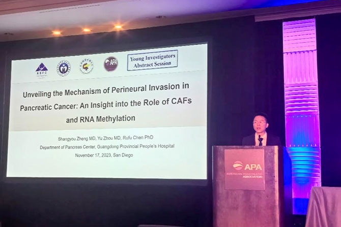 At this APA Annual Meeting, the immune microenvironment and neuroecology of pancreatic cancer, and the relationship between cell metabolism and pancreatic tumors and pancreatitis were reported and discussed in separate subsections. Scholars from all over the world delivered fascinating presentations on the hot and difficult topics of pancreatic disease-related basic, translational, and clinical research carried out by several top pancreatic disease research centers worldwide in recent years. Among the presenters, three were from China. Notably, Dr. Zheng Shangyou made a report titled "Unveiling the Mechanism of Perineural Invasion in Pancreatic Cancer: An Insight Into the Role of CAFs and RNA Methylation" which demonstrated Professor Chen Rufu's work in the creation and standardization of neurosurgical clearance in pancreatic cancer. He also shared the latest research findings in the field of pancreatic cancer neuroinvasion. For the first time, the project delved into the intricate mechanisms of how fibroblasts in the tumor microenvironment, at the level of RNA modification, promote neural invasion and tumor progression in pancreatic cancer. The research aroused strong interest among experts at the meeting, including Professor Michael Pflüger from Johns Hopkins Hospital in the United States, and sparked in-depth discussions and exchanges. International experts highly praised the study.