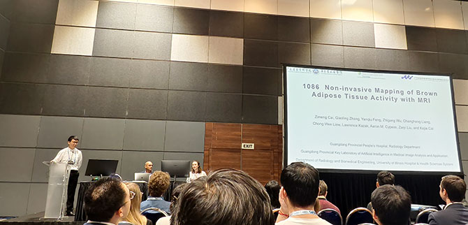 Dr. Cai Zimeng’s research, titled “Non-invasive mapping of brown adipose tissue activity with MRI,” was also awarded the Gold Award at the ISMRM 2024 and received enthusiastic responses during his oral presentation at the event. The study established creatine-based chemical exchange saturation transfer MRI (CrCEST MRI) as a promising non-invasive and radiation-free method for imaging brown adipose tissue activity. The endogenous CrCEST MRI technique provides molecular insights into the mechanisms of metabolic diseases through longitudinal and non-invasive means, aiding in early detection and risk stratification. Additionally, it serves as a biomarker for the development, evaluation, and guidance of new therapeutic strategies.