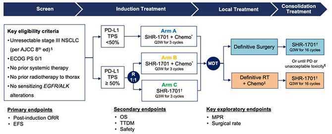 This study used SHR-1701, an immunotherapy drug independently developed in China, and enrolled 107 patients with unresectable stage III NSCLC, who were grouped according to different conditions. After completing 3 cycles of SHR-1701 combined with chemotherapy induction treatment, all patients underwent multidisciplinary team (MDT) consultation to determine the next step of treatment. For patients assessed as resectable by MDT, surgical treatment was performed; if still assessed as unresectable, those would enter the Department of Radiotherapy for radical chemoradiotherapy. After completing local treatment, all patients started 16 cycles of SHR-1701 consolidation therapy, followed by a follow-up phase.