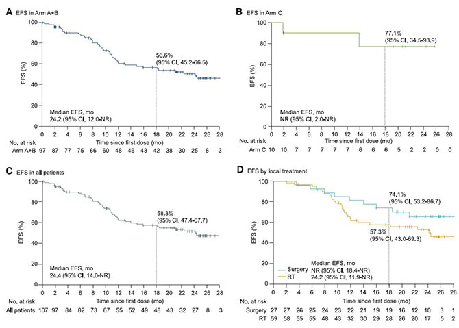 As of September 2023, the median follow-up time reached 22.2 months. The study results showed that after induction therapy, 25% of originally unresectable stage III NSCLC patients achieved surgical conditions, and all patients achieved R0 resection. Among them, 12 patients (44%) achieved major pathological response (MPR), 7 patients (26%) achieved pathological complete response (pCR), and the 18-month event-free survival rate was 74.1%. For patients receiving radiotherapy, the 18-month event-free survival rate was 57.3%. In other words, SHR-1701 combined with chemotherapy induction treatment converted about 1/4 of originally unresectable patients to resectable treatment, and patients who received surgery showed significantly better outcomes than those who received chemoradiotherapy.