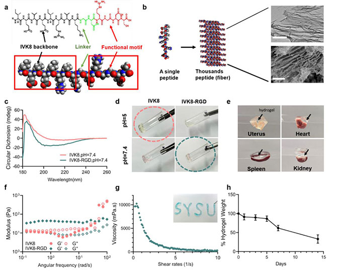 The self-assembled peptide IVK8-RGD consists of 14 amino acids and is grafted with an RGD (bioactive) sequence to improve its biological activity. This peptide solution, when mixed with cell suspensions under physiological conditions and incubated for a short time, can self-assemble into hydrogels. IVK8-RGD hydrogels exhibit excellent adhesion, stability, and injectability, which help stem cells adhere to the damaged endometrium for an extended period, enhancing the therapeutic effect.