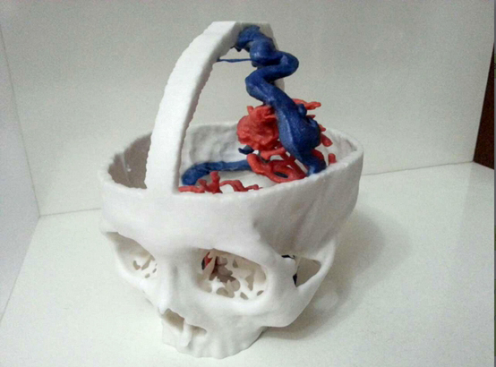 3D打印技术目前主要应用于工业制造等方面,在医学领域的应用刚刚崭露头角,主要集中在骨科模具的研究之中,在脑血管病领域的研究几乎处于空白。目前,由我院神经外科陈光忠主任医师与南方医科大学解剖研究室李鉴轶副教授联合承担的广东省科技计划项目“脑动静脉畸形数字化平台的建立及血管内介入治疗的个性化研究”进展顺利,成功打印出第一例脑动静脉畸形1:1模型。