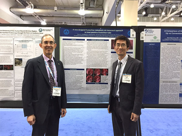今年前半年又完成八例,患者自全国各地慕名而来,甚至包括一名专程从加拿大飞回的同胞。到目前为止,痊愈及基本痊愈率为86%,优于目前报道的任一术式。Dennis Poe教授专程参观我院耳鼻喉科的展板,惊叹于该新创术式设计的缜密。小林俊光教授现场提了很多问题,并且希望能够合作,促进该领域的进一步提升。