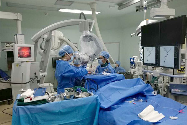 “杂交手术”是英文“Hybrid operation”的直译,也有人称“复合手术”。该手术方式除了要求具备杂交手术室等硬件外,还要求有强大的神经外科手术和介入治疗团队。杂交手术室与普通手术室最大的区别是包括可让X射线穿透的专用手术床和数字减影血管造影机(DSA)。手术室结构均经过特殊设计,在外科手术时可同时进行介入治疗和影像检查。手术医生可以同时从血管内和血管外对动脉瘤进行显影和控制,极大的提高了动脉瘤手术的安全性和治疗效果。由于“杂交手术”对手术硬件和科室治疗水平软件的要求极高,目前国内能够开展“杂交手术”的医院很少。我院近年建立的杂交手术室,并成功应用于心血管病的手术治疗,在神经外科脑血管动脉瘤手术上应用尚属首次。