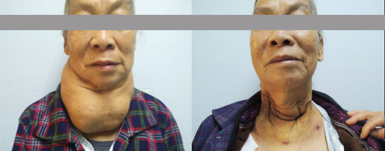 耳鼻喉科张思毅、罗小宁主任团队,经过详细周密的术前准备,手术如期进行。首先成功气管插管麻醉,接着暴露甲状腺肿物,结扎供血动脉,保护甲状旁腺及双侧喉返神经,最后完整切除双侧巨大甲状腺。手术历时约4小时,术后送监护室观察,第二天顺利拔除气管插管后转回普通病房。术后7天拆线,无出血、声嘶、抽搐、呼吸困难等并发症。术后在内分泌科团队的治疗配合下,徐婆婆康复出院,术后外观恢复正常。