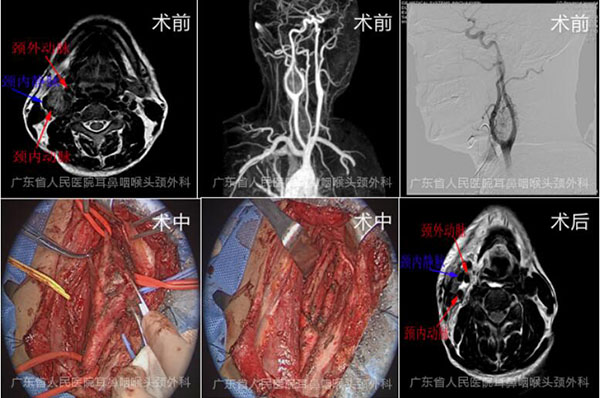 由于肿瘤血供丰富、病灶部位特殊、瘤体常包饶颈部重要血管神经,颈动脉体瘤外科是头颈外科和血管外科风险极高和极具挑战的手术之一。“宝剑锋从磨砺出,梅花香自苦寒来。”经过数代人的衣钵相承和突破创新,凭借日臻成熟和精益求精的临床技艺,广东省人民医院耳鼻咽喉头颈外科的头颈外科团队稳扎实打,依赖综合性医院多学科的保驾护航,不断攻克和斩获高难度的标志性手术,既积累和夯实了头颈肿瘤诊治经验,又提升了专科的竞争实力和展示度。