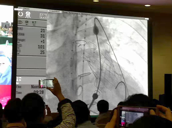 4月7日上午10:00,心儿科的张智伟副所长带领团队的谢育梅主任、谢兆丰副主任医师,在心导管室全麻下对患者施行了经股静脉PPVI术,成功植入瓣环直径32mm、长度20mm的人工肺动脉带瓣支架。术后肺动脉造影及超声心动图监测显示原有的肺动脉瓣返流消失,血流通畅,治疗效果满意。术中仅穿刺股动脉和股静脉,无需体外循环和气管插管,无需输血,伤口无需缝针,手术全程时间不到1个半小时,并在第十九届南方国际心血管会议的结构性心脏病国际论坛上进行现场直播,国内外的专家和同行对手术的成功给予了盛赞。