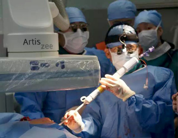 “中国是心脏瓣膜疾病高发国家,有200万以上患者,每年需要手术的患者在20万-30万”我院成人一区、心脏微创专业的学科带头人郭惠明主任说,这些患者,心脏主动脉瓣膜或狭窄或关闭不全,病变导致他们只要一活动,就会出现胸痛、胸闷,因气促、憋气而总是觉得“不够气”,很多人只能卧床,严重者甚至丧命。他形象地比喻说,这是因为,主动脉瓣是心脏最后出口,一旦狭窄、关闭不全,等于心系“下水道堵”,血流返流,往回走的血多了,不断冲刷心脏,容易引起心脏负荷增大,引发心脏扩张,从而心脏功能衰退、下降。对这种疾病,传统的解决方案是手术置换心脏瓣膜,也就是开胸切开心脏,进行体外循环后让心脏停跳,切除原瓣膜,置换新瓣膜。手术成熟成功率高,但是病人要承受一定的痛苦。郭惠明指出。如何治疗高危高龄患者,减少病人痛苦,更好的让手术更少创伤,这一直是医务人员与科研人员在探索的问题。