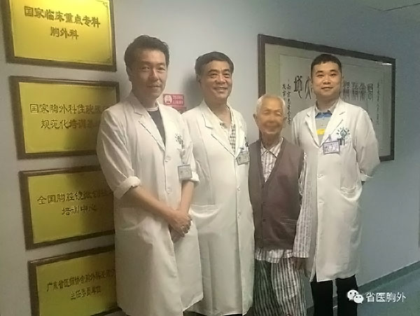 截至目前,胸外科已经采用多种微创手术方法,成功治疗大量早期及局部晚期高龄肺癌患者,其中包括数例90岁以上的超高龄患者。他们中有的已经在手术后健康存活十余年,现已达百岁高龄。近期还有一位老人,在78岁时曾在因肺癌在我科手术切除右上肺叶,十余年后91岁因左侧第二原发肺癌再次在我院就诊,陈刚主任再次成功对他进行了左侧微创肺段切除肺癌拫治手术。