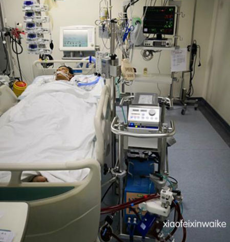 胸外心脏按压、气管插管、呼吸机辅助呼吸,转入心外ICU进一步抢救……一切都在有条不紊的进行着。患者一度恢复房颤心律,但是反复室上速、室速,在持续泵入升压药物的情况下血压仅仅维持在60mmHg上下。血气分析显示严重代谢性酸中毒,血乳酸水平甚至超过了仪器测量的上限。这是一例典型的难治性心跳骤停病例!时间一分一秒在流逝,患者复苏的机会也渐渐渺茫。心外科范瑞新主任、肖飞博士、周成斌主任等紧急协商,判断患者通过传统心肺复苏技术难以恢复有效自主循环,立即启动了体外心肺复苏(ECPR)程序,在心外ICU床边经股动、静脉插管,迅速开始了体外膜肺(ECMO)治疗。不到半小时,患者的心律稳定了下来。8小时以后,患者奇迹般的苏醒了过来。ECMO继续辅助48小时以后,患者成功接受了主动脉瓣置换、二尖瓣置换、三尖瓣成形手术。术后继续给予ECMO辅助治疗(图2)。
