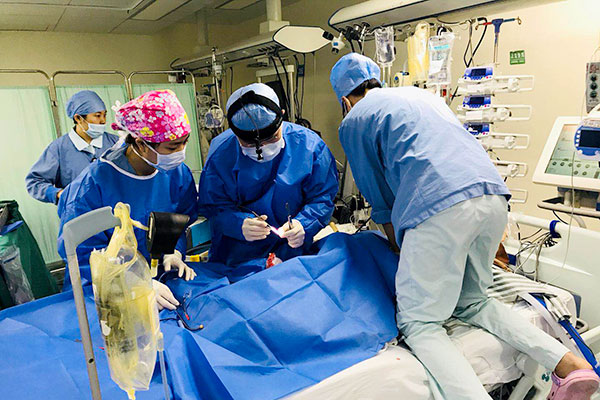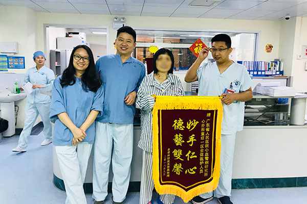 术后第二天晚上,患者突发室颤,呼之不应,立即予心脏电除术2次+心肺复苏术,但效果欠佳,心电监测仍提示室颤律。心外重症监护一区马上采取紧急措施,在持续心脏按压下,配合体外循环组予ECMO置入。全程按压42分钟,后可转自主心律,同时积极予输血扩容、血管活性药维持循环稳定及脑保护措施……经有效抢救,4小时后患者恢复意识。