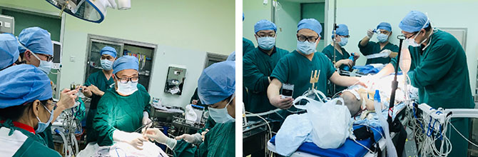 周成斌主任为爆发性心肌炎患儿进行ECMO插管(左图),和术后心脏超声评估(右图)