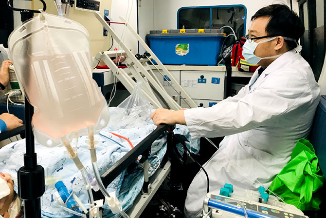 ECMO长途转运中,医务人员严密观察ECMO运行状况和患儿病情