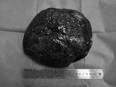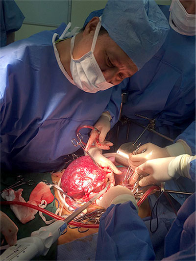 在做好术前各项可能发生的手术意外应急预案后,手术于早上八点正式开始。患者麻醉打开腹腔后,见整个肝脏右叶、中叶全部为肿物占据,并同时挤压第一、第二、第三肝门。评估剩余肝脏体积能代偿维持正常肝功能,并充分将肝脏与周围脏器组织游离。在阻断肝脏血流防止大出血的情况下,沿着血管瘤包膜进行肿物完整剥离,以最大化保留正常肝组织。术后切除的肝血管瘤测量直径20cm,重2.5kg。如此巨大的血管瘤对外科医生的临床经验与心理素质是重大的考验。术后患者恢复顺利,如释重负!