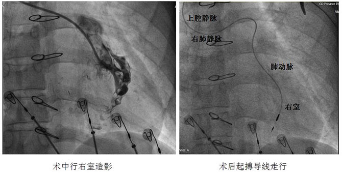 手术当日,主刀医师方咸宏主任经过数次更换导丝,配合特殊鞘支撑,历时2个多小时,顺利将普通细电极从左锁骨下静脉、上腔静脉、右肺动脉、肺动脉,经过两个直角弯后送至右室,最终成功为患者植入单腔起搏器,避免了患者的第三次开胸,同时也开创了TECPC术后植入心内膜起搏器的先例。