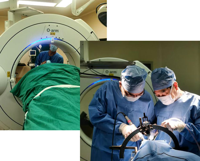 以周东主任为首的神经外科治疗团队,对李伯进行术前详细评估,符合DBS手术标准。手术由神经外科周东主任和秦琨主刀。首先定位好脑内需要刺激的核团靶点,然后通过立体定向头架,从额叶切两个口入路,将刺激电极放置入目标核团,再将电刺激器放入脑内靶点。能否精准的将电极放入脑内的目标位置,是决定该手术成败的关键因素。以往放置电极主要通过立体定向专用头架在MR和CT的帮助下完成,操作比较繁复。目前,神经外科将O臂引入整个手术操作流程,在放置电极的过程中,进一步明确了刺激器电极的位置,也确认了颅内的基本情况,提高了手术精确性和安全性,同时也使手术更为顺畅。