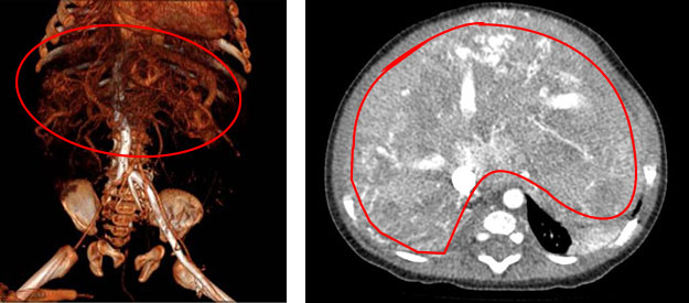 婴儿型肝血管内皮细胞瘤临床少见,发病率约1%,90%好发于6个月以下的婴儿。由于肝脏血管丰富,穿刺活检容易大出血,术前主要依靠影像诊断。早期诊断困难,容易误诊。合并肝动静脉分流者更是罕见,可引起充血性心力衰竭和呼吸衰竭、腹腔间隔室综合征、凝血功能障碍,甚至肝衰竭等致命性的并发症,病死率可高达90%。一旦确诊,应尽早治疗,避免发展为失代偿性心力衰竭,从而降低死亡率,改善预后。