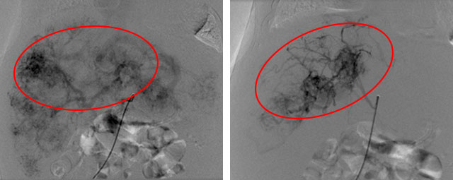 一边积极维持血流动力学稳定,一边积极跟家长沟通病情,并做好术前准备。次日张靖主任主导手术。术中见肝脏多发血管瘤及多发肝动静脉瘘形成,术中给予肝动脉栓塞,再次造影显示动静脉瘘明显减少,手术过程非常顺利。