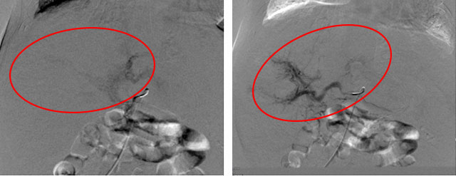 此病例并不多见,我院没有治疗经验。所幸我院人才引进的介入科主任张靖是国内血管介入治疗领域权威专家。他仔细查看患儿肝脏超声及影像资料,凭借丰富临床经验,判断儿童肝脏肿瘤约1/2为血管源性肿瘤,包括血管内皮细胞瘤及海绵状血管瘤,6个月以下小婴儿主要是血管内皮细胞瘤。张靖主任认为,该病例很可能是婴儿型肝内皮细胞瘤伴动静脉瘘,由于分流量过大而导致血管容量负荷过重,具有介入手术指征。若不尽早介入,内科保守治疗难以遏制病情进展。