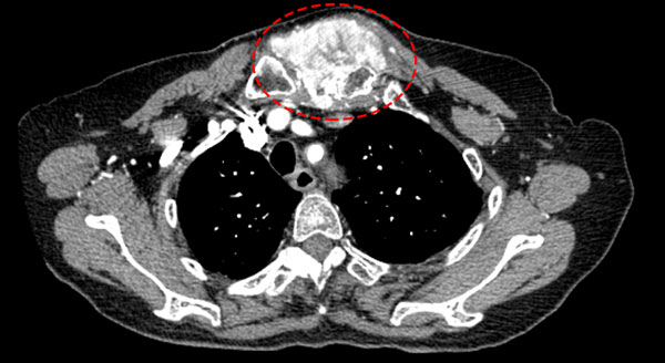 (肿瘤巨大严重侵蚀胸骨)