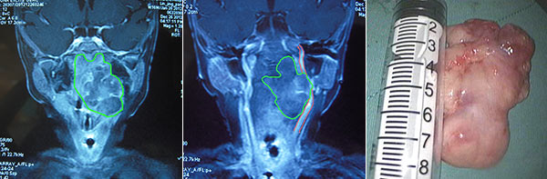 左:咽旁、咽后间隙的巨大肿瘤;中:肿瘤压迫大血管;右:切除的肿瘤