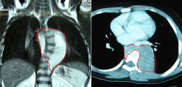 年仅8岁的嘉嘉无意间被父母发现脊柱侧弯畸形,经CT检查发现后纵隔长了一个大小约10cm×7.5cm的肿瘤,形状像个大萝卜,紧贴并包绕降主动脉、胸椎、椎间孔和后胸壁并跨过脊柱对侧,并且从降主动脉内分出多支肿瘤滋养血管。小孩子自己没什么感觉,倒是吓坏了嘉嘉父母。辗转就诊省内多家知名大医院,均因手术风险大,担心肿瘤如果侵犯降主动脉无法彻底切除或导致致命的大出血而不能收入院手术治疗。嘉嘉父母通过熟人、朋友和网络四处查询打听,最终了解到我院胸外科是国家临床重点专科,在治疗胸腔中肿瘤有丰富经验时,抱者一丝希望带着嘉嘉来到我院胸外科就诊。该科主任陈刚接诊患儿后,认真阅片、详细询问检查患儿后告知其父母,如果要彻底切除肿瘤,手术难度非常大、风险很高,但不切除肿瘤嘉嘉的病情会越来越重,而且脊柱侧弯也会继续加重。