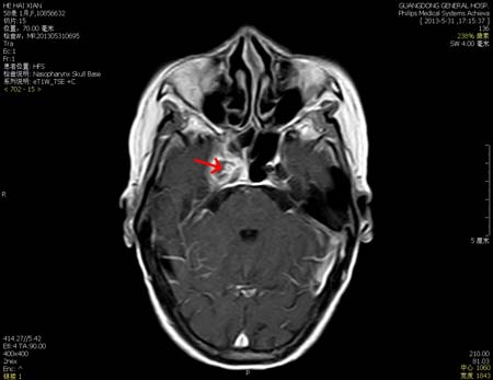 近日,耳鼻咽喉科邱前辉主任会诊一个特殊病例。从一进病房,邱主任就发现这名女性患者一直抱着头蜷缩在病床上,表情痛苦。详细了解病情后得知,该患者58岁,4个月前出现头痛,没有发热、无肢体乏力等明显诱因,主要症状为右侧颞部胀痛,呈持续性,并逐渐加重,2个月前出现右侧眼球活动障碍,向右侧注视困难。该患者曾到多家医院就诊,经多项检查,均没有确切的诊断,只予止痛治疗,但病情返复。后来,经多方打听后,转到了我院。