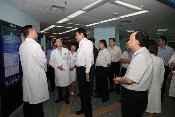 2015年5月11日下午,邓海光副省长及省政府副秘书长李捍东、省卫生计生委陈元胜主任、黄飞副主任一行,冒着大雨莅临我院调研指导,我院院长庄建、党委书记耿庆山等班子成员参加了调研活动。邓副省长走访考察了我院东川门急诊、东川药房、英东楼心研所,听取庄院长、耿书记分别就医院基本情况、心研所学科建设及保健工作做的简要汇报,并就我院建设混合所有制心脑专科医院等重大项目作出指示,希望我院加强与上级有关部门沟通,加快推进项目进程,在新形势下探索出公立医院发展创新之路。