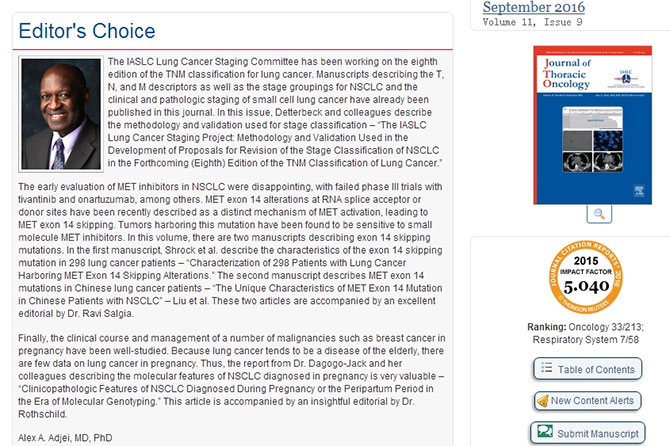 金秋9月,吴一龙教授团队关于MET 14 外显子突变的研究成果被国际肺癌研究学会(IASLC)官方期刊《Journal of Thoracic Oncology》被推选为当期重点文章推广报道。