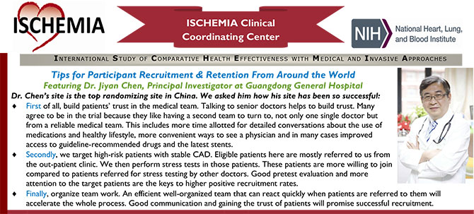 在9月最新一期ISCHEMIA(International Study of Comparative Health Effectiveness with Medical and Invasive Approaches) 研究的全球通讯报告中,我院心内科陈纪言主任代表中国向全世界介绍我中心的研究经验。