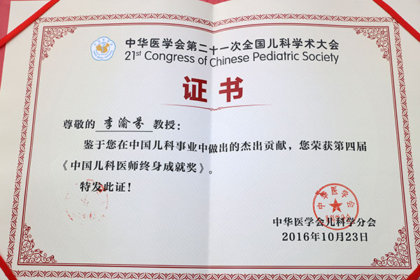 10月21-23日,在中华医学会第二十一次全国儿科学术大会上,我院终身主任、心儿科主任医师李渝芬主任荣获第四届中国儿科医师“终身成就奖”。
