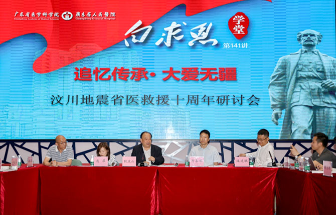 2018年4月18日,白求恩学堂联合《羊城晚报》举办“追忆传承·大爱无疆——汶川地震省医救援十周年研讨会”,省卫生计生委党办主任刘占锋、医院党委书记耿庆山、参与汶川地震救援的广东医疗队部分队员、部分援疆援外队员、中层干部和青年医务人员参加了此次座谈会,集体回忆了在汶川地震治伤救灾的经历,共同凝练抗震救灾的省医大爱精神。