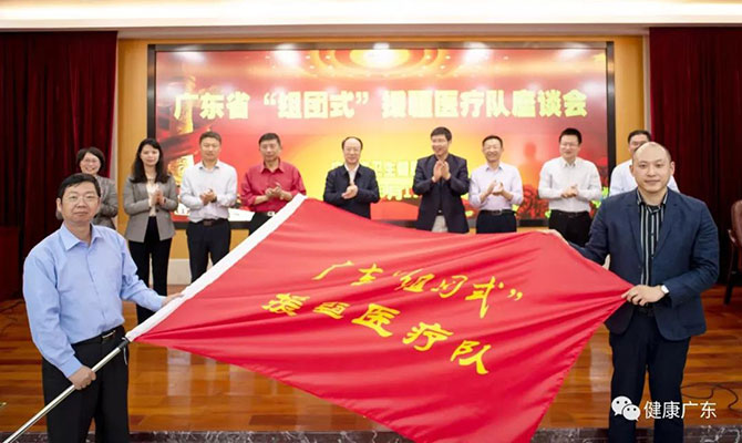 3月19日下午,省卫健委在广州举行广东省医疗人才“组团式”援疆工作队压茬交接座谈会,热烈欢送广东省医疗人才“组团式”援疆工作队24名援疆医疗队员。我院党委书记耿庆山同志和4位“组团式”援疆队员出席了会议,精神卫生中心杨程甲医生代表广东省第三批“组团式”援疆队员发言。现场还为第三批和第四批队员举行了交旗仪式。