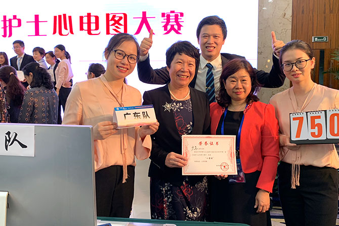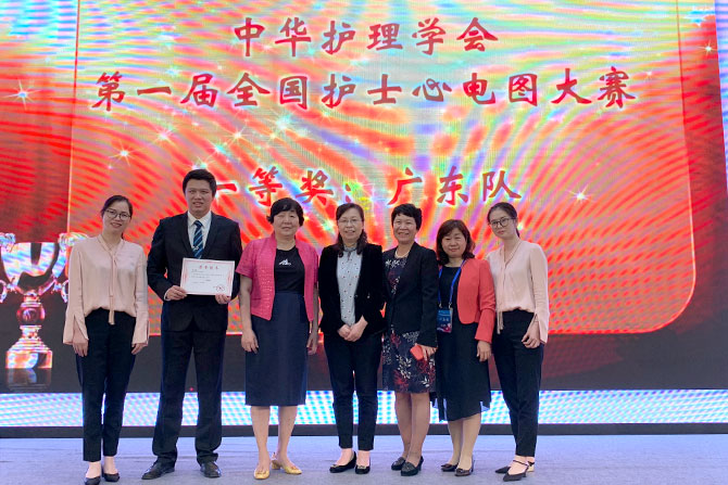 2019年4月20日,由中华护理学会举办的第一届全国护士心电图大赛在湖南长沙举行。在广东省护理学会心血管专委会、广东省人民医院护理部陈凌主任的领导及精心组织下,我院CCU黄嘉熙、丘伟燕、詹晓燕三位选手经过院赛、省赛层层选拔,最终代表广东省队参加全国比赛,由心内科CCU林丽霞护长担任领队。在本次竞赛中,代表队经过激烈的角逐,历经三轮比赛,不负众望,在全国23支省代表队中脱颖而出,以满分的成绩摘得桂冠,荣获一等奖,为广东赢得殊荣。这是继2016、2018年的中国心电大比武蝉联两届“中华牌”心电大赛冠军后,又一次在“中华牌”国字号大赛中摘得桂冠,充分展现了我院各级领导高度重视心血管护士的专业素质的培养。再一次掀起护士学习心电图的热潮。