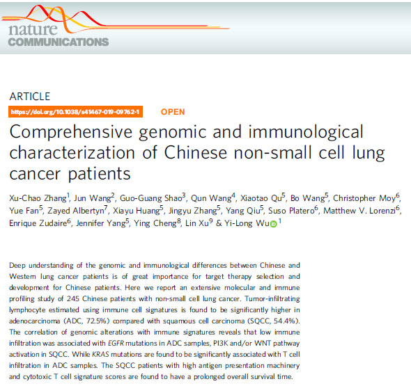 2019年4月16日,我院广东省肺癌研究所团队报道了关于“中国非小细胞肺癌基因谱和免疫学特征(CHOICE研究)”的最新研究成果。肺癌研究所张绪超所长(第一作者)、吴一龙教授(通讯作者)领衔北京大学人民医院、吉林大学第一医院等单位的肿瘤学专家,撰文《Comprehensive genomic and immunological characterization of Chinese non-small cell lung cancer patients》正式发表在国际Nature子期刊《Nature Communications》杂志上(中科院二区,IF=12.41),这是一本在线多学科期刊,致力于在生物、物理和化学科学的所有领域发表高质量的研究,该杂志发表的论文代表了各领域专家的重要进展。