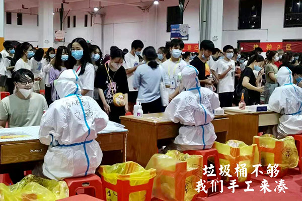 驰援增城第一分队20人:分队对接组长宋湘红,2021年6月5日夜晚21:45分到达增城了,这里是广东工业大学增城区的学院,工作人员都已经连续工作多时了,我们紧急派了20个人来接应他们,到了之后马上接替这里的志愿者和工作人员的任务。
