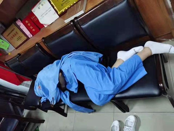 28 日从早上 8 点到凌晨 12 点,一直工作了 16 个小时刘冬丽主管护师,一轮采集核酸工作后,抓紧时间躺在椅子上休息,恢复体力,好接着继续工作,为佛山市民采集核酸。