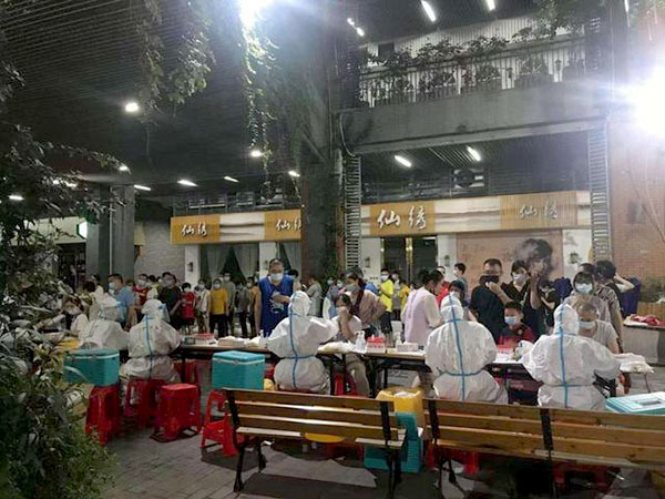 他们 11 点 10 开展采样工作。经历了暴雨,到接下来的暴晒,很多同事的 N95 已经汗透了,现场还有七八百市民顶在烈日下排着队。