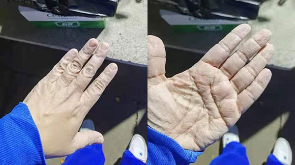一轮工作下来,除了全身湿透,包裹在 2 层手套里的手被汗水泡得又皱又白。