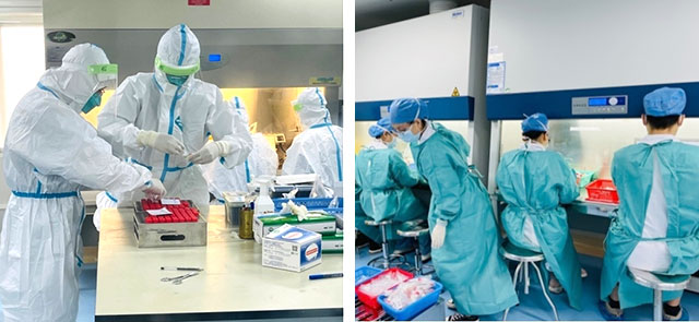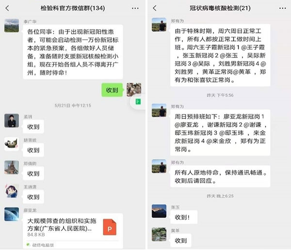 除了做好院内的核酸检测工作,检验科还时刻准备支援国家抗疫工作。在处/科室的协调组织下,支援用的仪器、耗材、有外援经验的骨干人员迅速到位。5月31日,周静芳和吴际派往广州市政府组织的核酸检测督导小组,驻点承担广州市筛查任务的第三方检测机构;张玉紧急支援广州市第八人民医院。