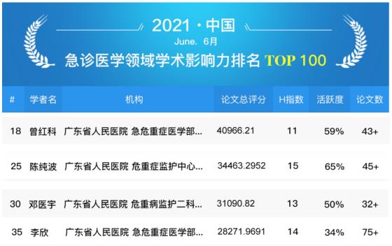 2021年6月“全球学者库”发布了全国急诊医学领域专家学术影响力百强榜单,我院曾红科教授、陈纯波教授、邓医宇教授和李欣教授分别列第18、25、30和35位。从学术竞争力的角度,反映出我院专家在急诊医学领域的权威性和学术水平。