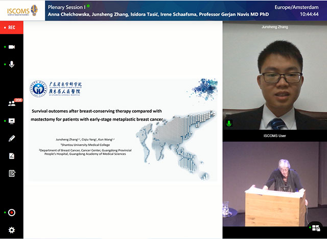 另一项研究是2021年6月8-10日在荷兰格罗尼根举行的第28届国际(生物)医学研讨会(ISCOMS)上,王坤主任指导2019级研究生张俊升的研究成果入选ISCOMS 2021大会特邀报告,因疫情原因在线上进行了题为“早期化生性乳腺癌患者行保乳治疗对比乳房单纯切除术的生存分析”的口头汇报,引起国际同行的广泛关注和热议。