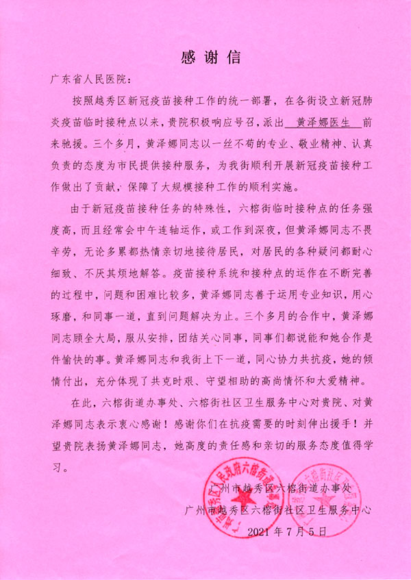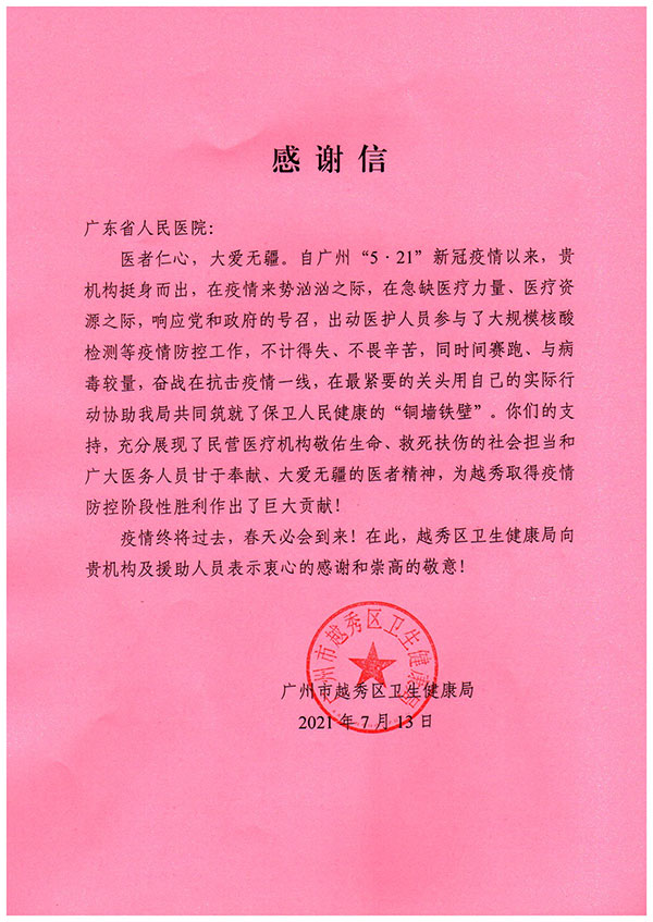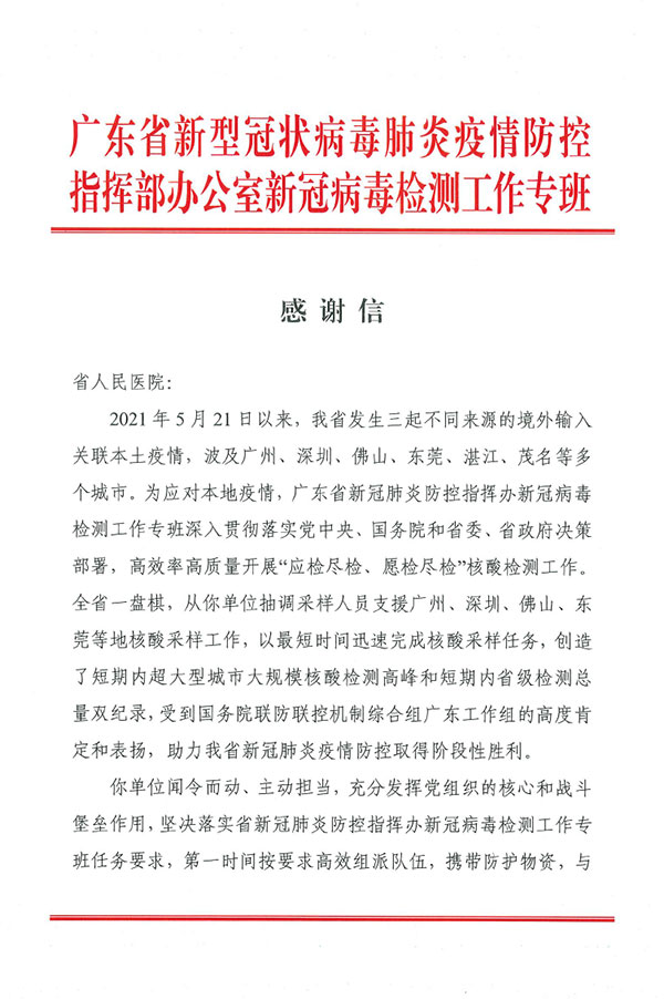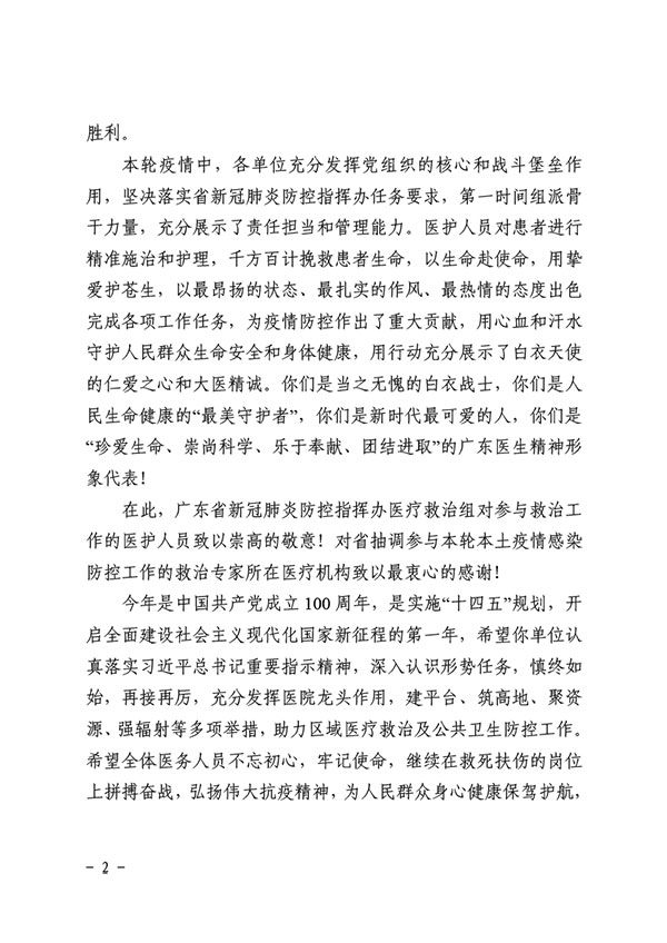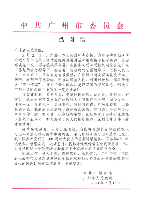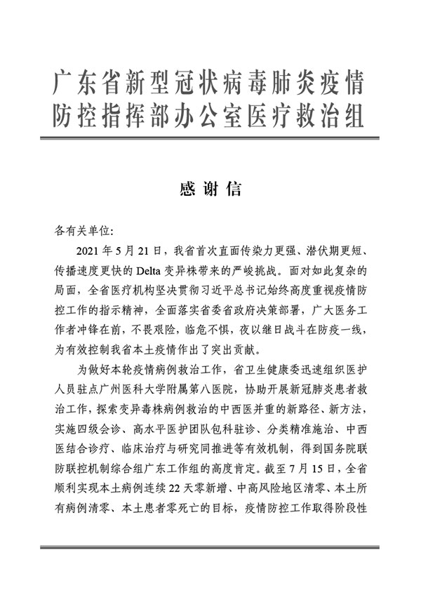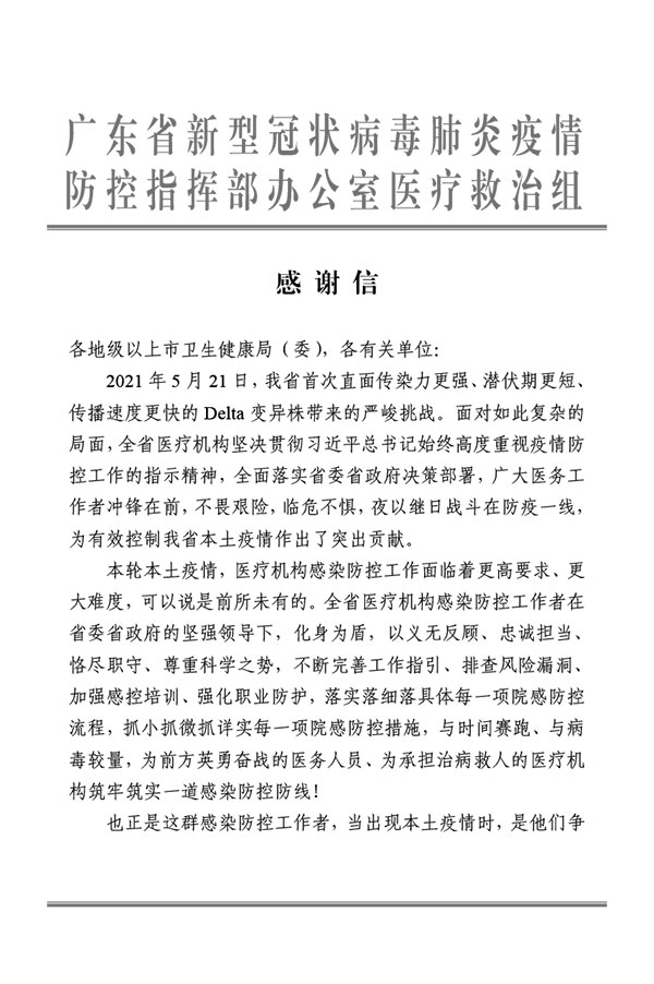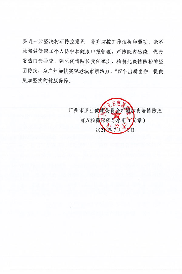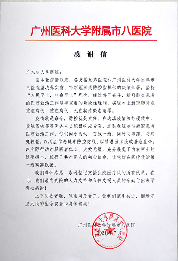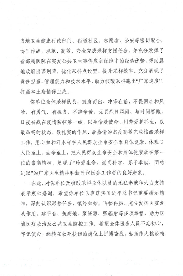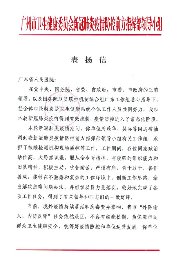 广州新一轮新冠肺炎疫情期间,我院医务人员表现出“国有召,召心回,战必胜”的抗疫精神,在不同岗位上,政治站位高、大局意识强,吃苦肯干,善作善成,较好地完成了各项工作任务,得到了有关领导和同志们的一致好评。