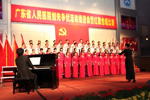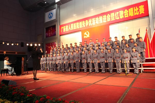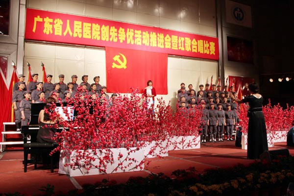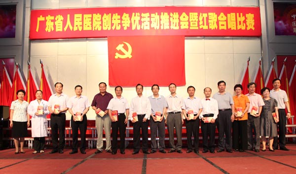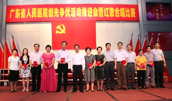 6月8日下午,近800名党员职工齐集我院门诊住院楼四楼多功能厅,人气鼎盛。院党委在此举办广东省人民医院创先争优活动推进会暨红歌合唱比赛,会上进行党内优秀表彰,首发《共产党员格言录Ⅱ》,会后进行红歌合唱比赛。党委书记曾国洪作创先争优阶段性工作总结和动员讲话,庄建、崔建星、何斌、王启仪、张念樵、袁向东、林展翼等院领导、全部党总支书记以及民主党派代表出席。